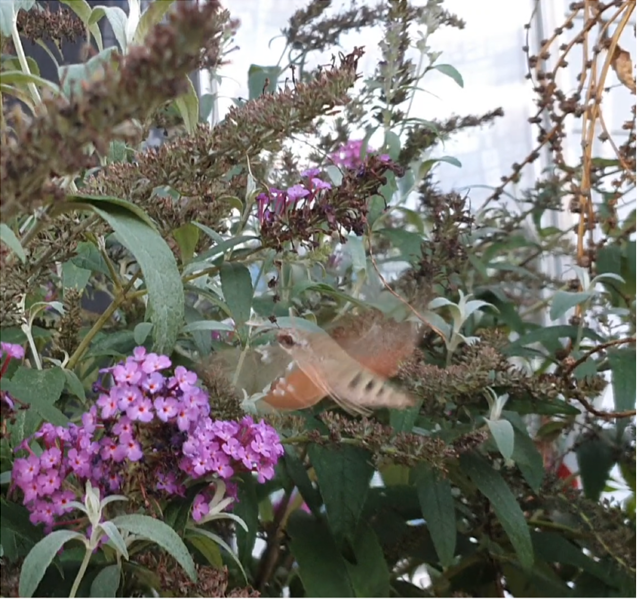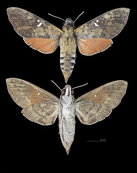 These are screenshots from a video my mum took yesterday, of this moth that I’ve been unable to identify. It was a pretty big moth in my opinion, as I’d never seen a moth that big before lmao. It was flying like how hummingbirds fly, which is why you can’t really see the wings properly. The body is a light brown, the top wings are the same light brown, with a small white spot on each of them, and the underwings are orange. It’s butt has bands of darker brown on it, and it clearly has long antenna.