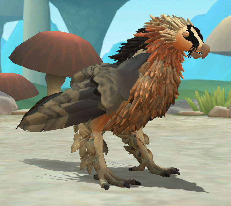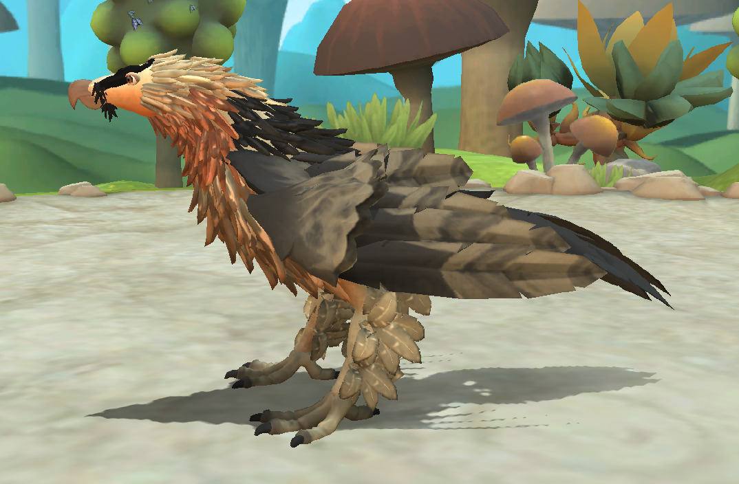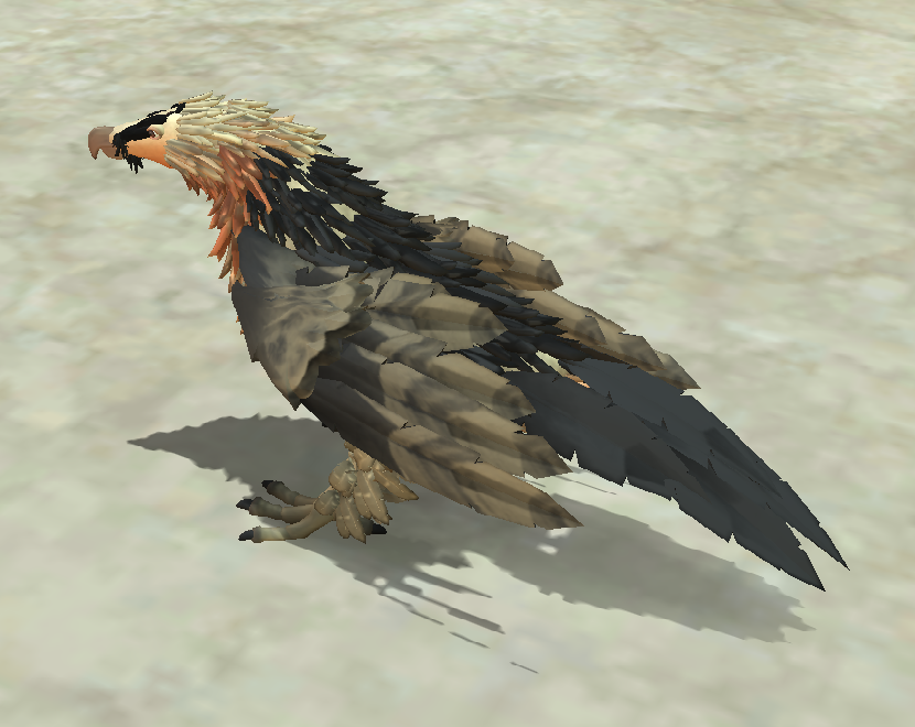Image description: Four screenshots of a Bearded Vulture that was made in spore, shown at different angles, and in different positions. The vulture has cream and orange feathers on its face and neck, and transitions to black feathers on the back and wings. It has black feathers going down its face in two stripes.