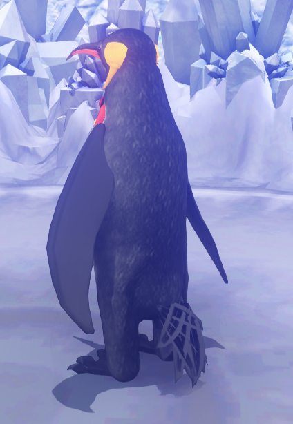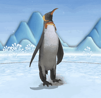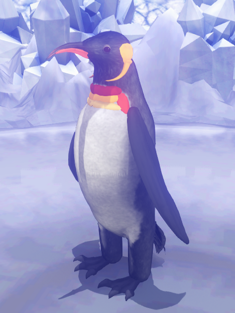 Image description: Three screenshots showing a realistic looking King Penguin at different angles, in front of a snowy background.
