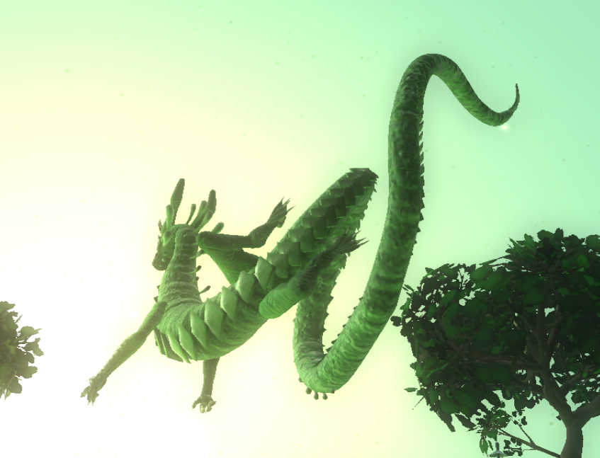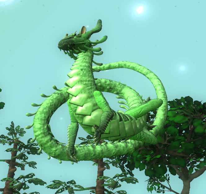 Image description: Three screenshots at different angles of Windsinger, a light green eastern dragon, that was made in spore. He is curled in a spiral shape as he flies forward.