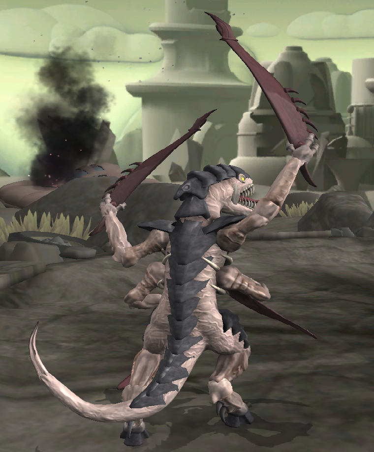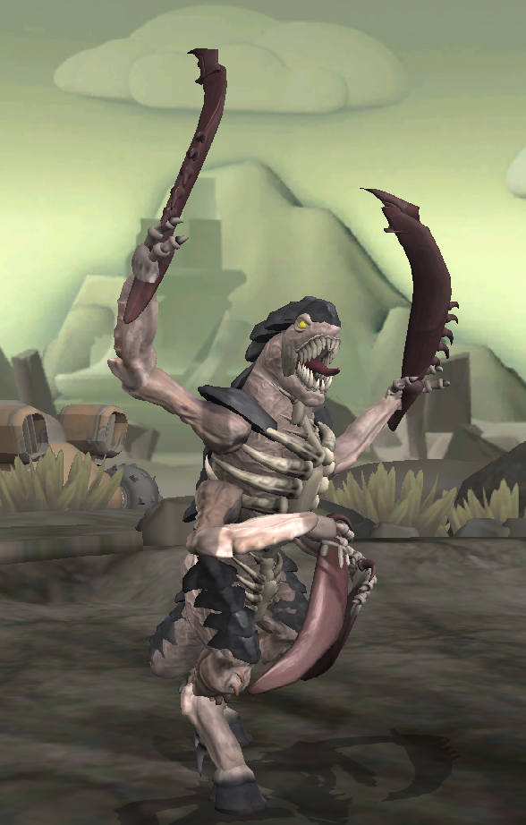 Image description: Four screenshots of a Tyranid from Warhammer 40k that was made in spore, all in different angles. The tyranid has four arms and is holding blades in each, raising two of them up into the air, as it roars.