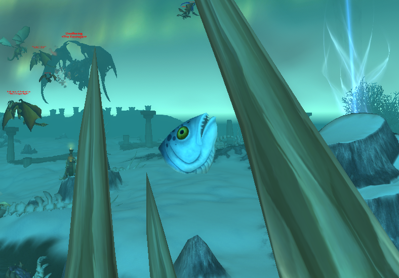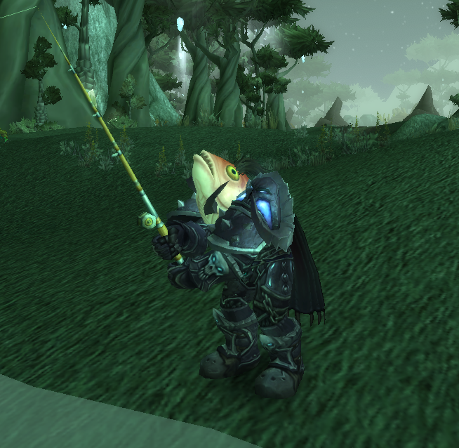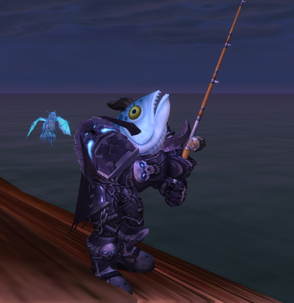 During the Darkmoonfaire, one of Grokkar's friends decided to sneak up behind him while he was fishing and stuck a big fish head on him, which he found rather difficult to remove. Then, at some point, Grokkar's pysical body randomly became corporeal, and all that could be seen of him was the fish head he still wore.