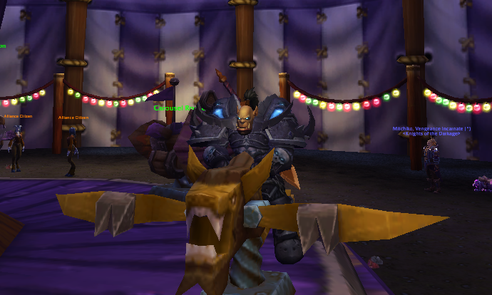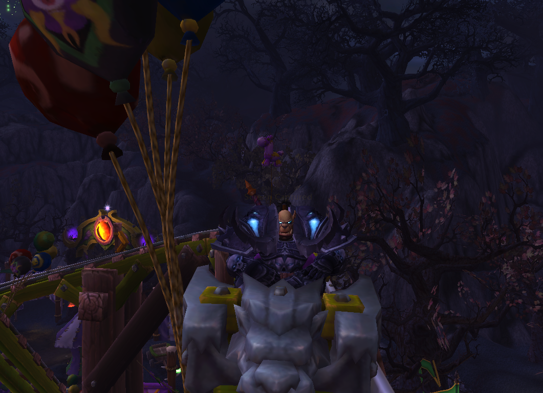 Grokkar begrugingly riding some of the rides at the Darkmoonfaire, at the behest of one of his friends who told him he needed to "lighten up" and "try to have fun for once."