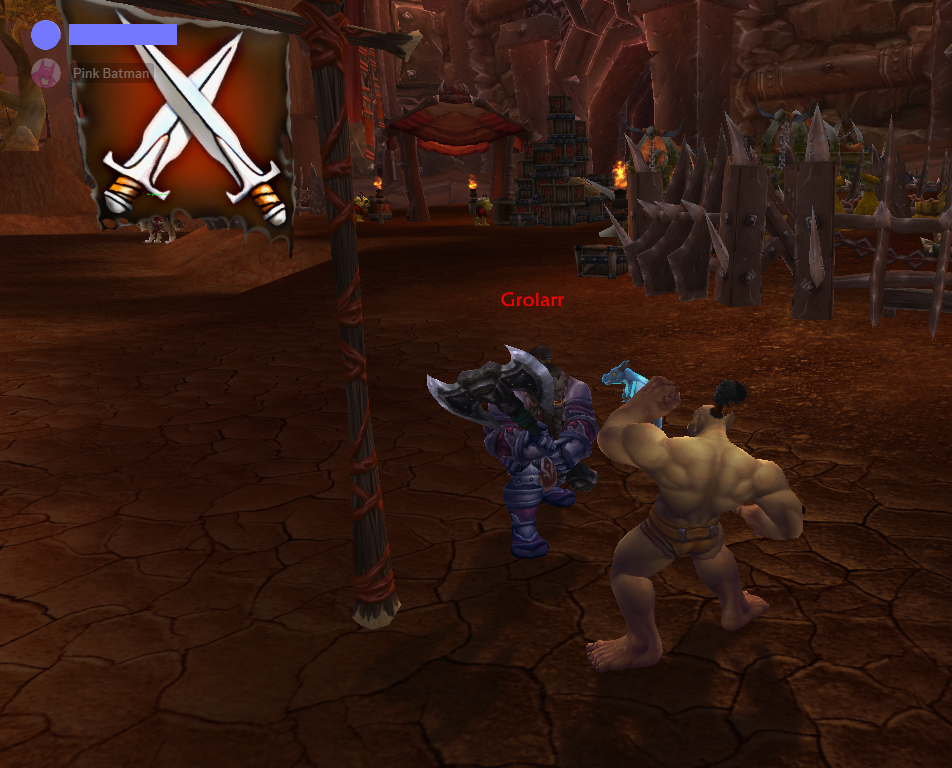 My friend L playing as his character Grolarr, and me playing as Grokkar. Grokkar was level 70 and his spec at the time was Blood, and Grolarr...was a level 10 warrior. I wanted to get my buddy L some WoW game time but he felt bad about the idea of me just giving him stuff, so I challenged his lvl 10 warrrior to defeat my lvl 70 DK tank, and if he could...I would get him game time. The caveats were that my character Grokkar had to be naked and wasn't allowed to attack so I could give my friend L a fighting chance. It took about an hour for Grolarr to get Grokkar down to 1hp, but he did it! And I got my buddy L WoW time as a reward :)